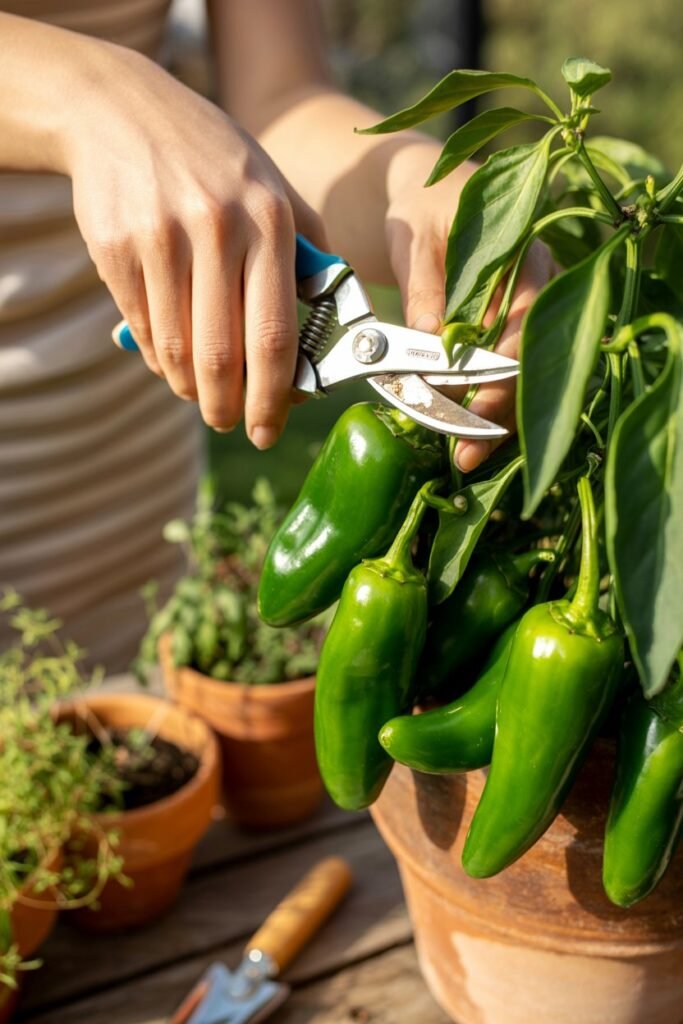 Pruning jalapeños in pots helps them focus energy on productive branches rather than unnecessary leafy growth.