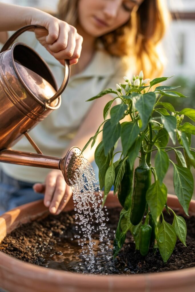 Every watering, alternate between plain water and a diluted fertilizer solution. Jalapeños thrive when fed gently and consistently.