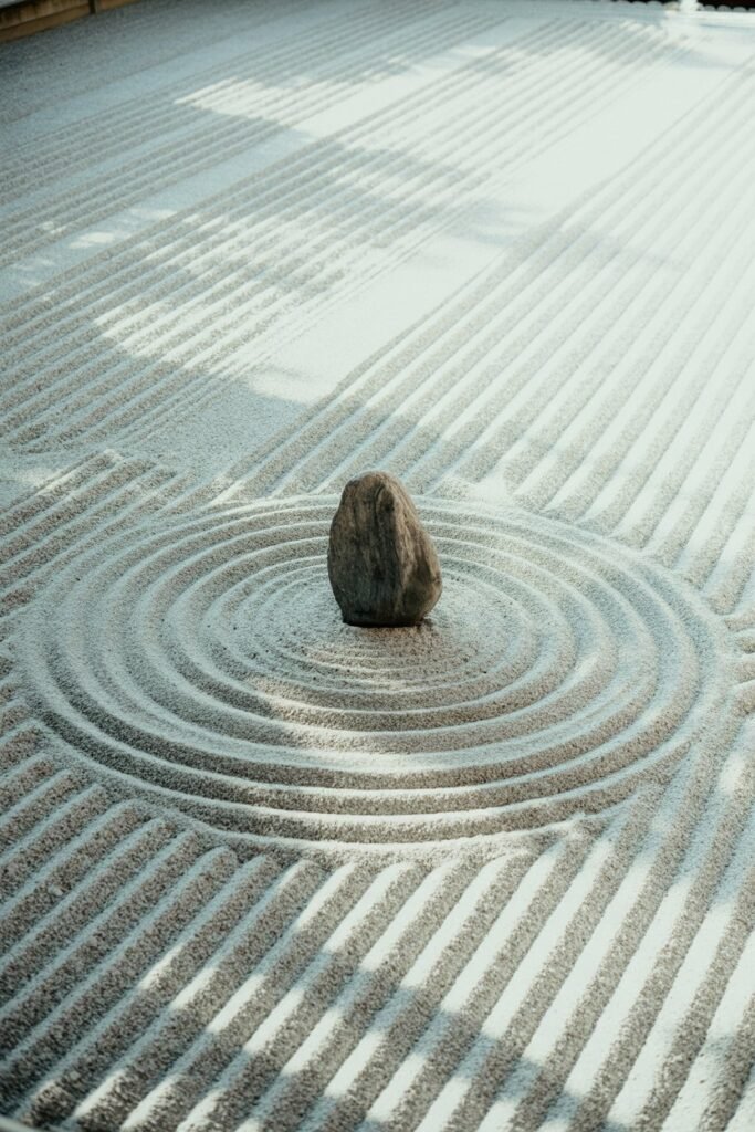 - Rake patterns slowly and intentionally; straight lines feel calm, while curved lines feel fluid.