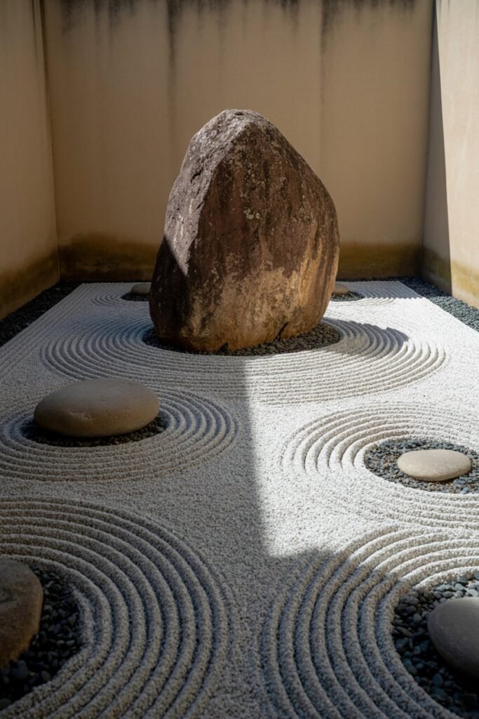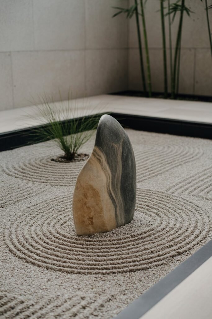 A central stone feature acts like an anchor emotionally and visually. In Zen design, stones symbolize strength, permanence, and stability.