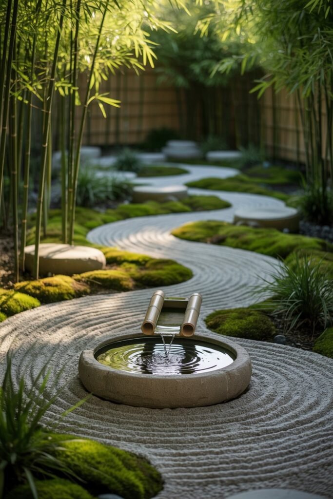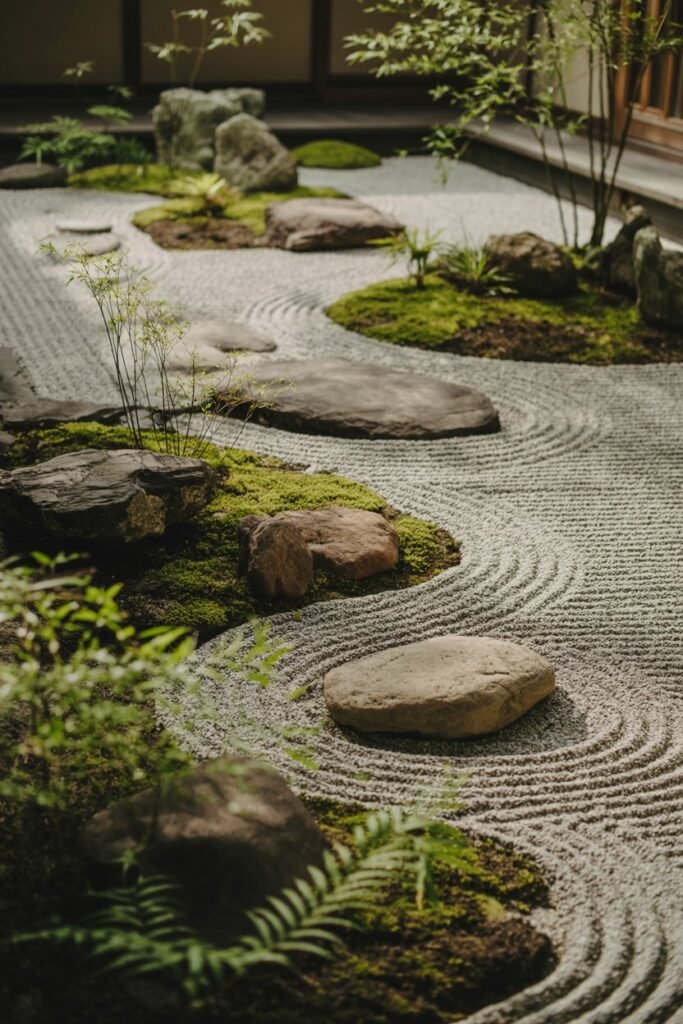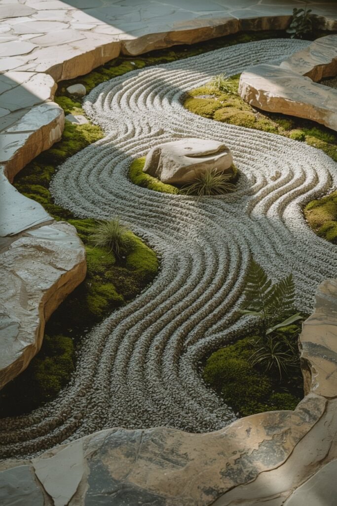 This is the heart of Zen garden design simple, grounding, and deeply symbolic. Raked gravel represents water, movement, and the flow of life.