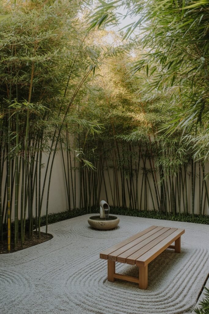 Zen gardens often need a sense of enclosure to feel peaceful. Bamboo creates a living wall that blocks noise, movement, and distraction while adding gentle sound as it sways in the breeze.