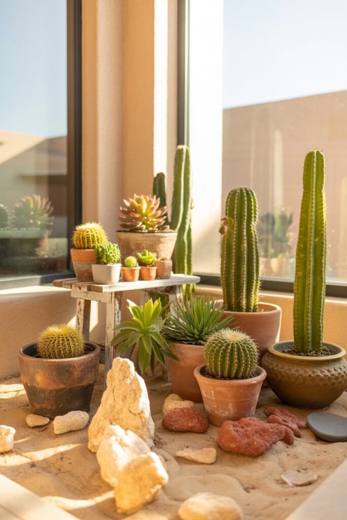 - Cactus and Succulents: Mix tall, spiky cacti with small rosettes.