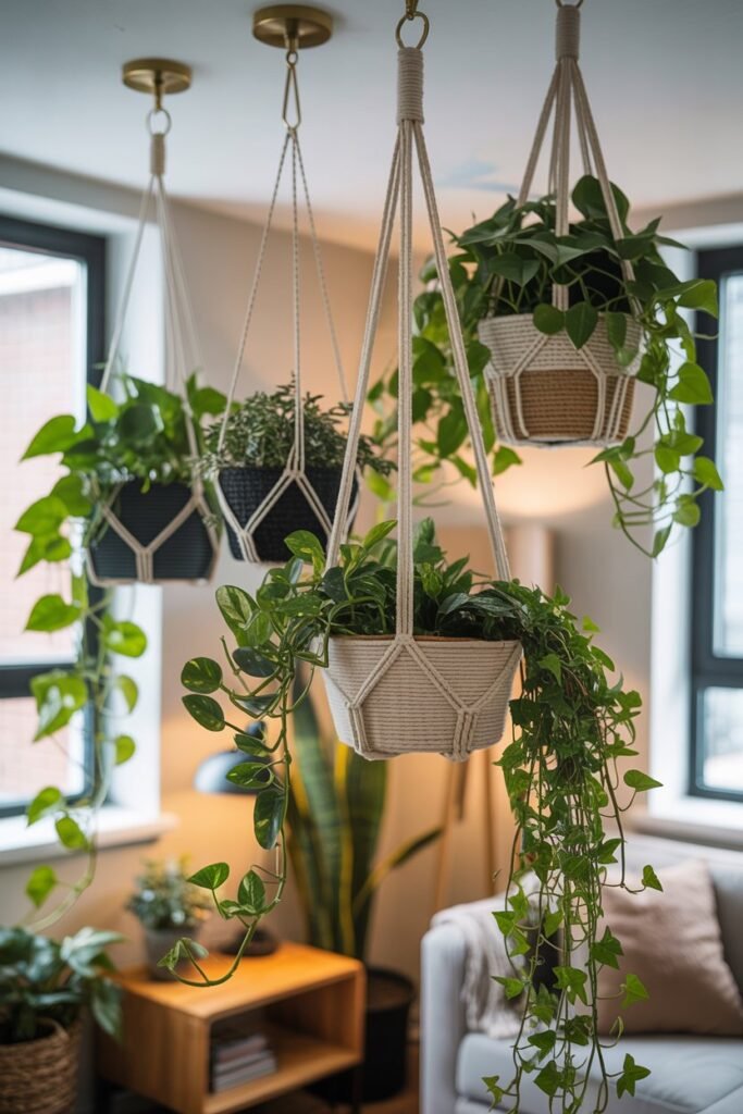 - Hanging Planters: Macramé or woven pots for a layered look.
