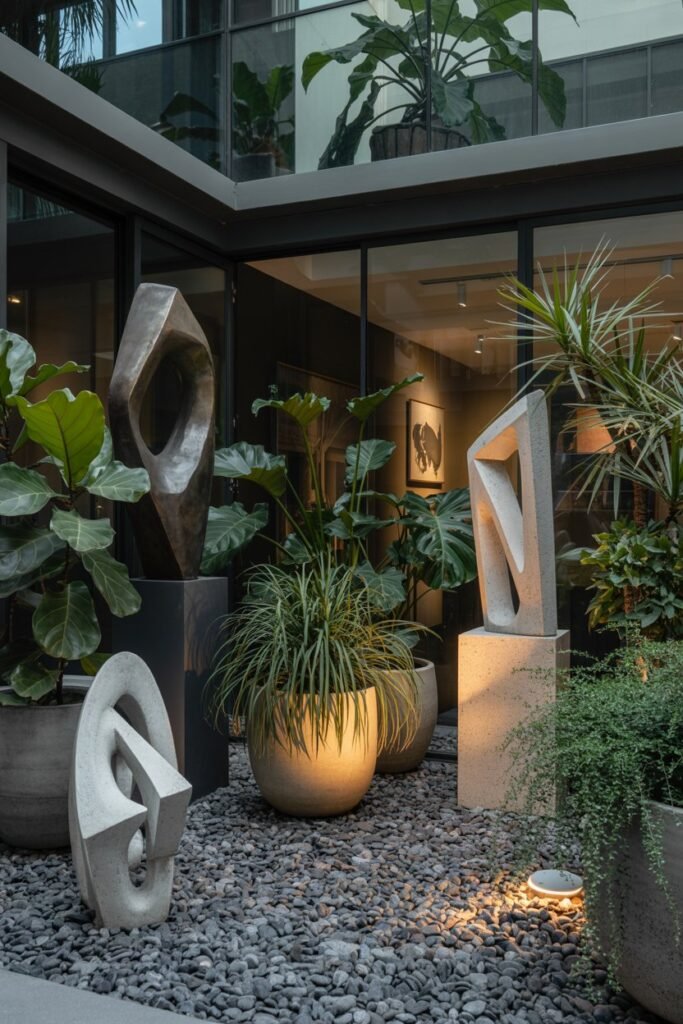 - Modern Planters: Concrete or ceramic planters complement the glass.