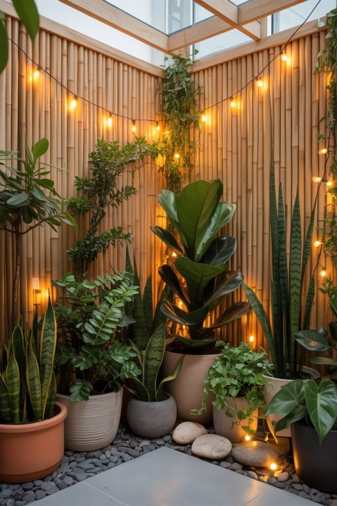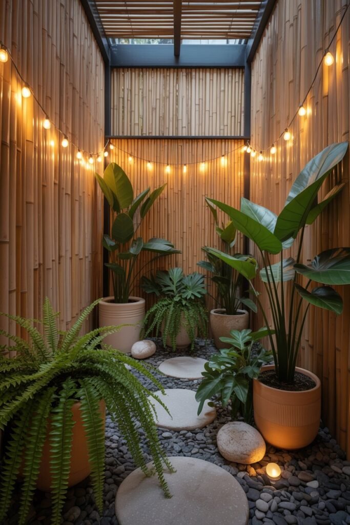 - Bamboo or Wooden Accents: Screens, pathways, or planters.