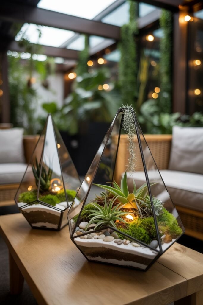 I love incorporating terrarium tables in small courtyards. They’re perfect for desk corners, coffee tables, or reading nooks, giving the sense of a mini forest indoors.