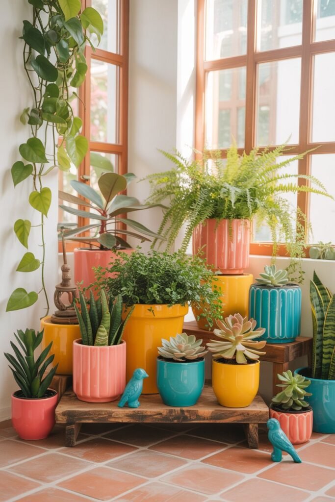 Bright, colorful pots bring cheerfulness and personality. I love using a mix of bold colors to complement green plants it instantly lifts the mood of the room.