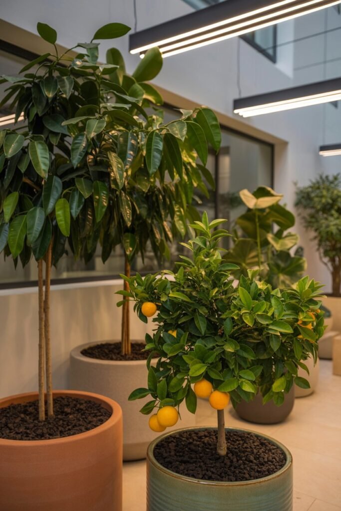 Adding small indoor trees gives height, structure, and a natural feel. I planted ficus and dwarf citrus trees, and they instantly made the space feel alive and vibrant.