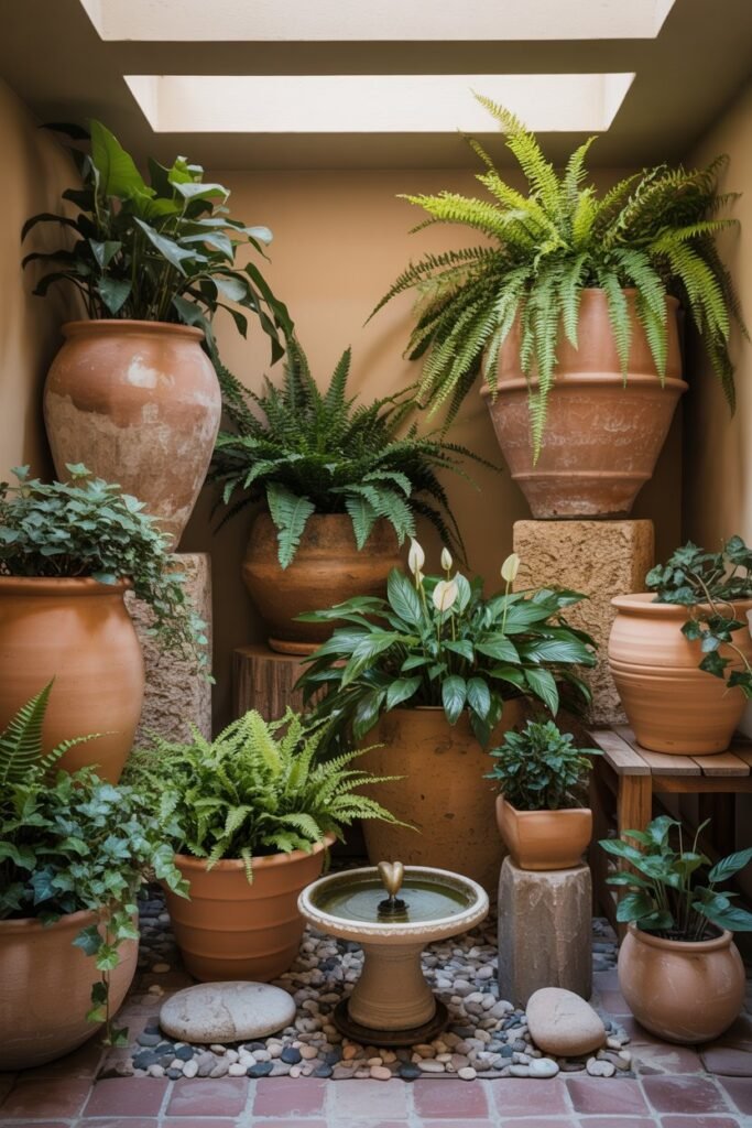 Terracotta pots and accents bring warmth and earthy charm. I love pairing them with lush plants and small decorative items to create a cozy, rustic indoor courtyard.