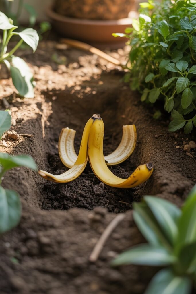 Always bury banana peels deep enough so they don’t attract pests. Once covered well with soil, they quietly decompose and feed your plant over time.