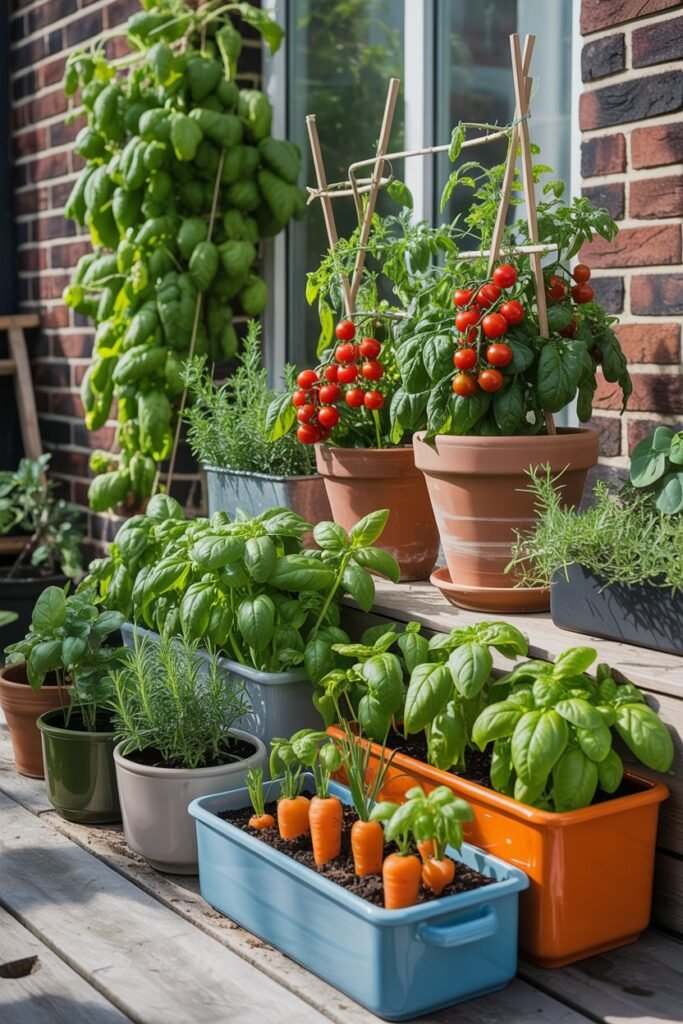 Grow tomatoes, spinach, onions, carrots, and garlic in pots.