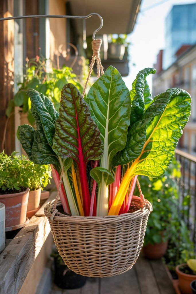 Swiss chard is one of the most underrated hanging basket vegetables. Its colorful stems add visual interest while providing a steady supply of nutritious greens.