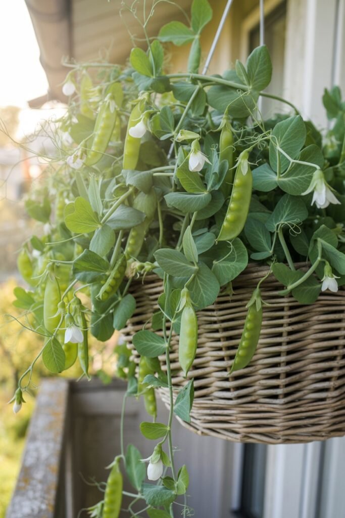 Dwarf peas are delicate, graceful, and incredibly rewarding. Their tendrils trail beautifully over the basket edge, and the flowers are just as charming as the harvest.