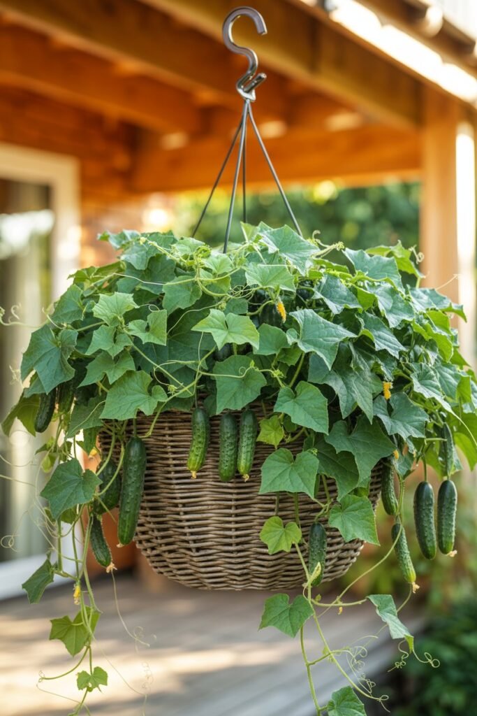 Bush cucumbers stay compact and produce smaller fruits that won’t weigh down the basket.