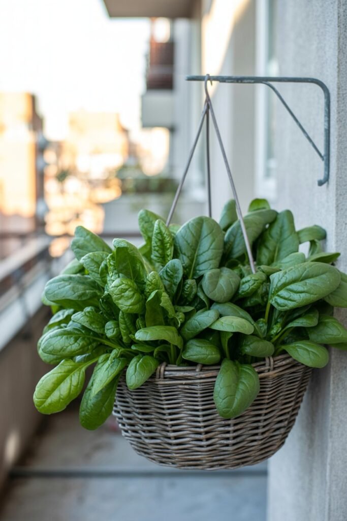 Because spinach prefers cooler temperatures and evenly moist soil, hanging baskets keep it well-ventilated while avoiding soggy roots.