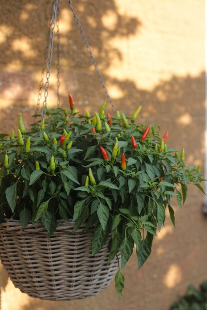 - Use a sturdy hanging basket (peppers get top-heavy)