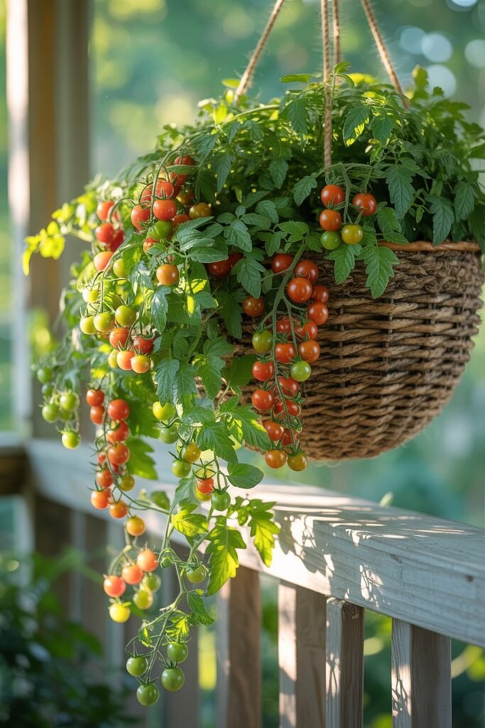 Instead of growing upward like traditional tomatoes, they spill gently over the basket edge, loaded with fruit.