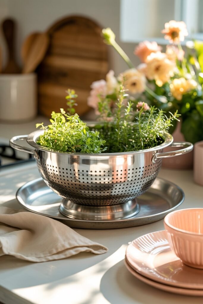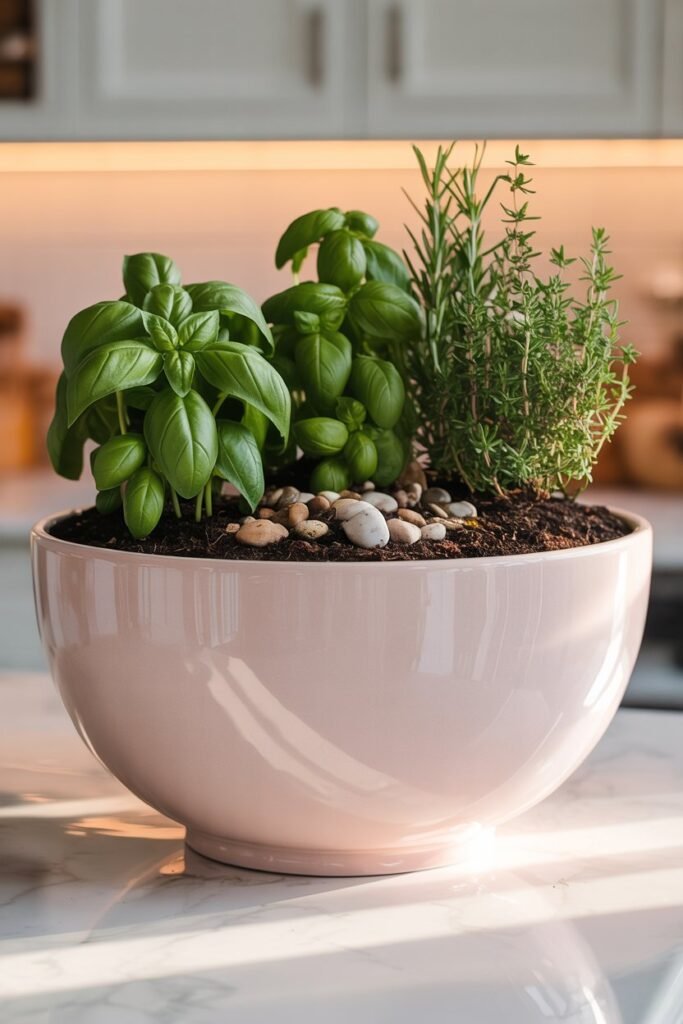 Fill a deep ceramic mixing bowl with soil, plant herbs or small houseplants, and place it on a kitchen counter for a feminine, cozy look.