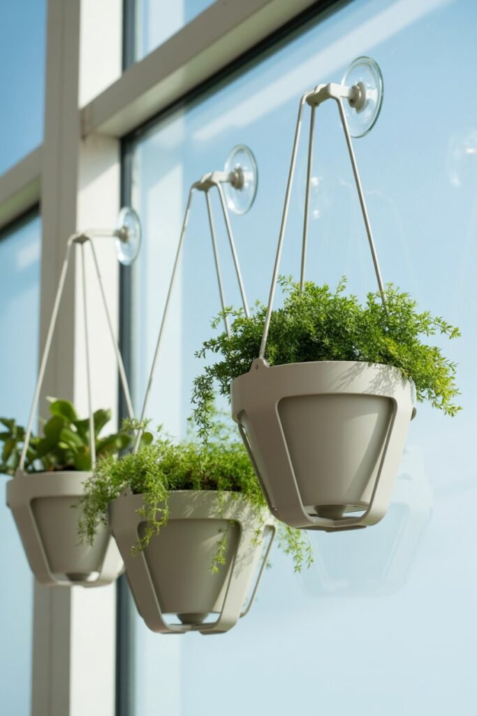 Attach pots to your window using suction cup hangers.
