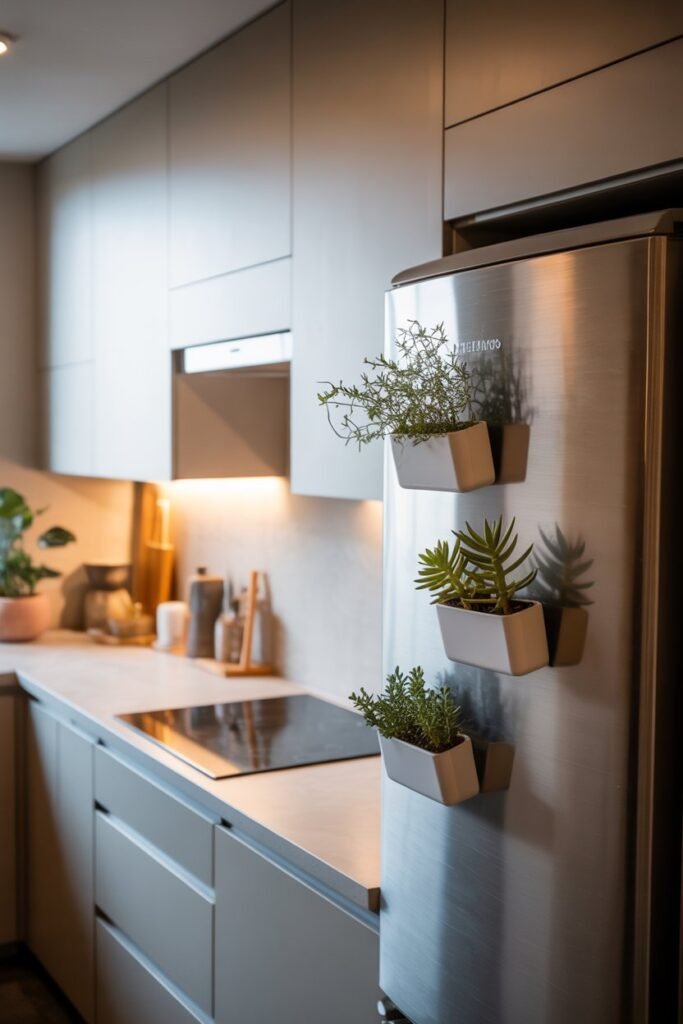 Tiny magnetic planters turn your refrigerator into a vertical mini-garden that makes the whole kitchen feel fresher.