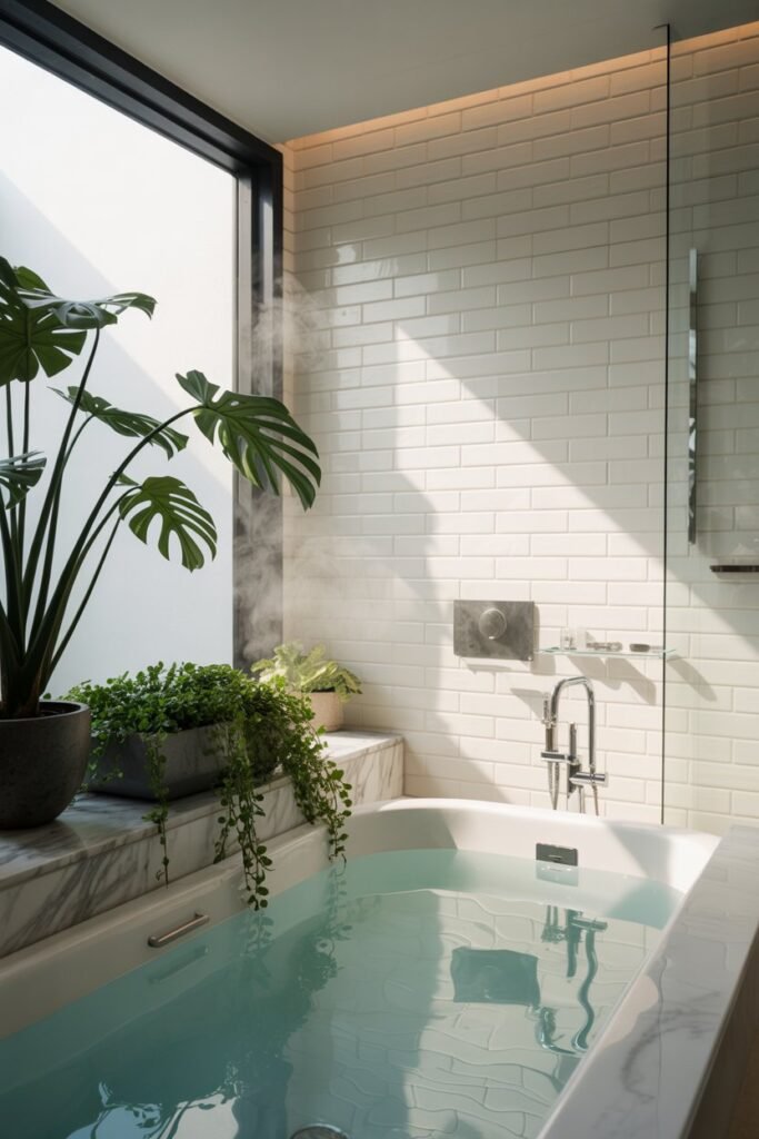If your bathroom has a tub ledge, you have a built-in plant shelf. It brings instant spa vibes—soft, calming, and perfect for moisture-loving plants.