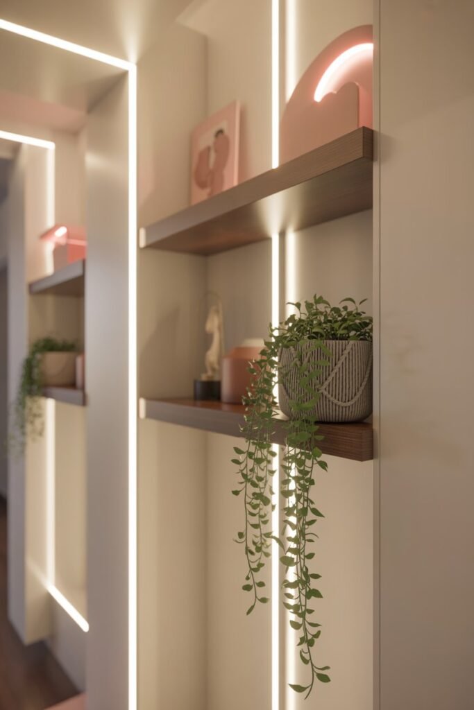 This is a brilliant way to add plants to a room without using floors or surfaces. A narrow vertical planter beside a door gives the space a gentle, lively touch—like a green “greeting” every time you walk in.