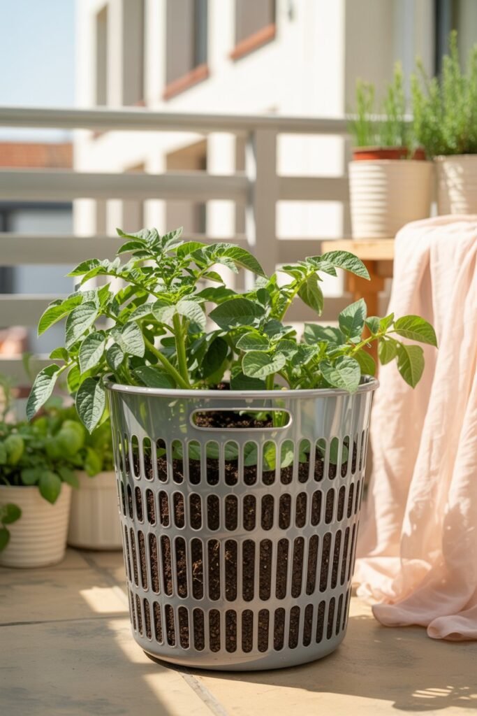 Laundry baskets (with holes) offer excellent drainage and space for root vegetables like potatoes, carrots, ginger, and turmeric.