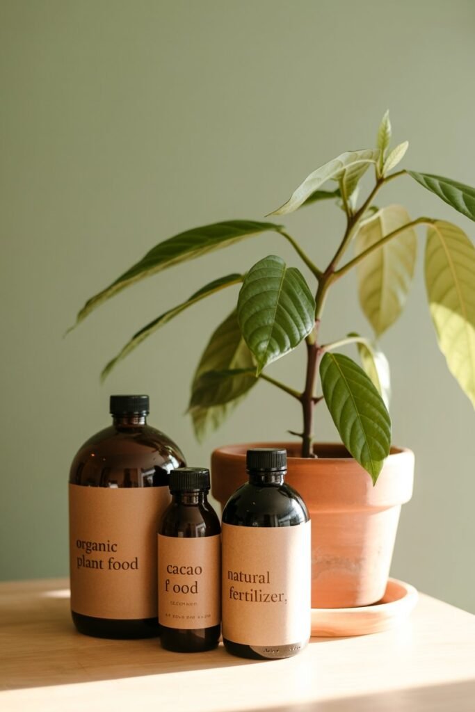 Indoor cacao trees benefit from regular feeding during their growing season (spring and summer).