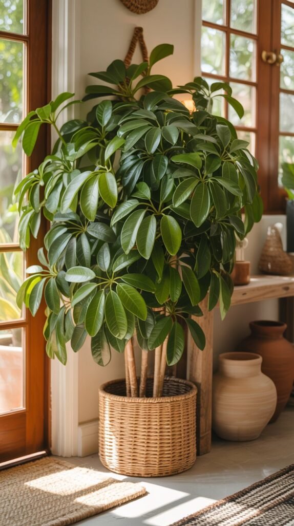 Schefflera has glossy, umbrella-shaped leaves that work like natural indoor filters.