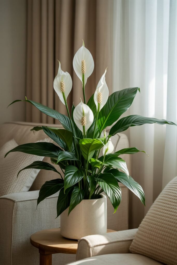 Peace lilies soften heavy air almost immediately.