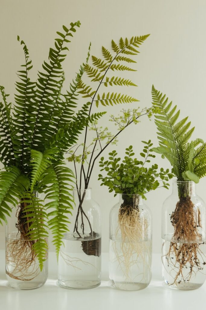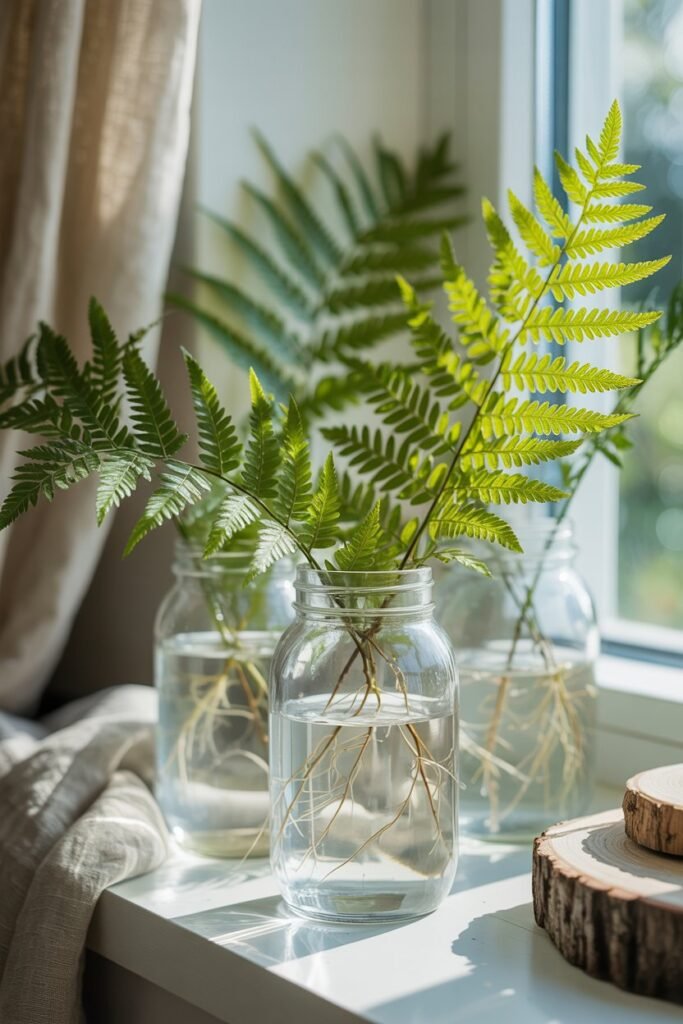 Clear jars filled with delicate green fronds and visible roots add a soft, soothing touch to any room.