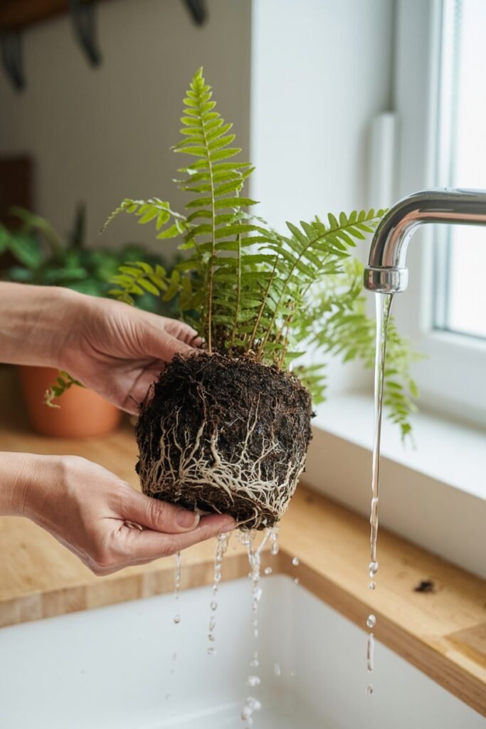 This softens the soil and prevents root shock. - Turn the pot sideways and ease the fern out slowly.