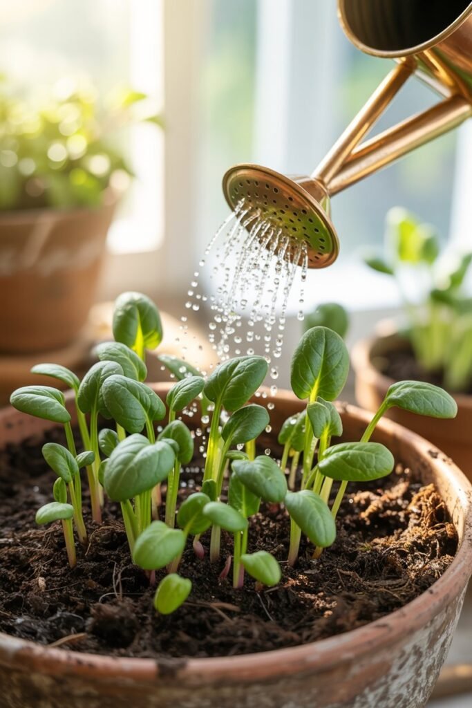Spinach seedlings are delicate. A harsh water stream can displace seeds.