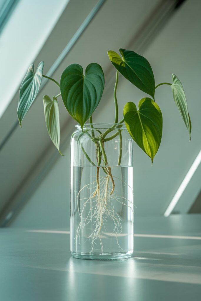 Philodendrons root quickly, stay stable in water, and continue growing for long periods without needing soil immediately.