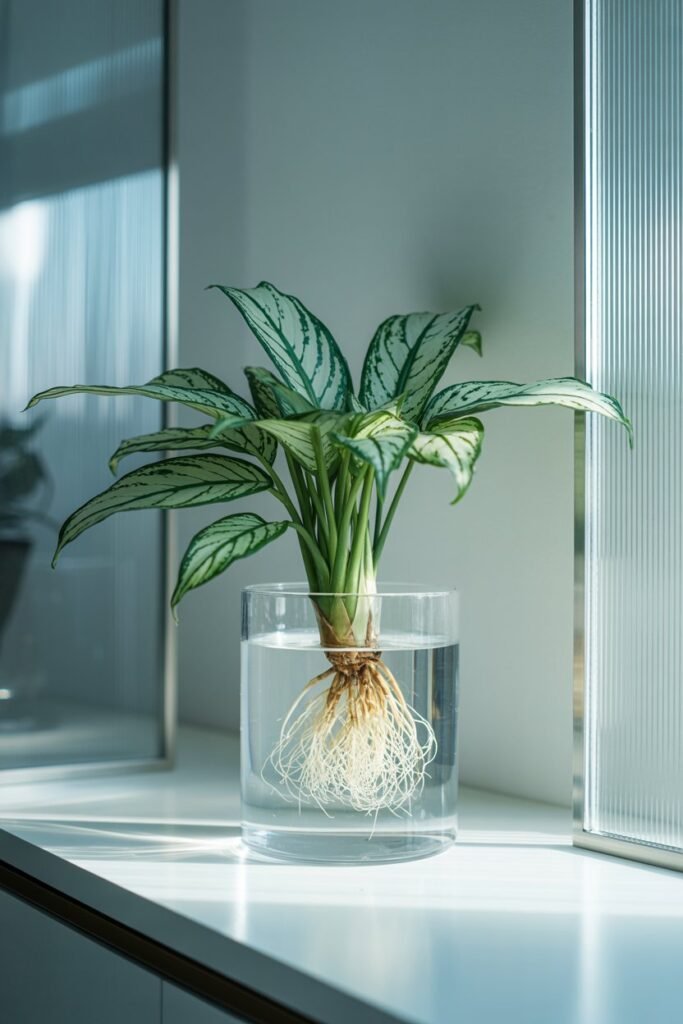 Aglaonema prefers softer light. Avoid placing it directly in front of strong windows while rooting.