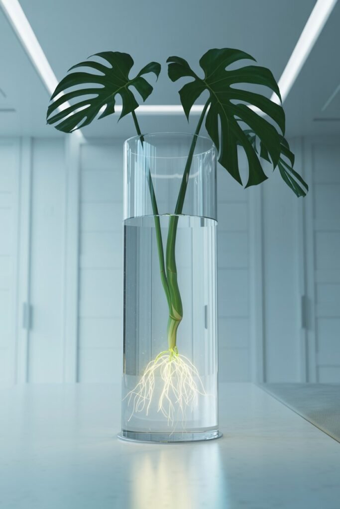 Monstera Deliciosa has thick stems with natural aerial nodes that root quickly once placed in water. It adapts easily and begins forming strong white roots within a few weeks.