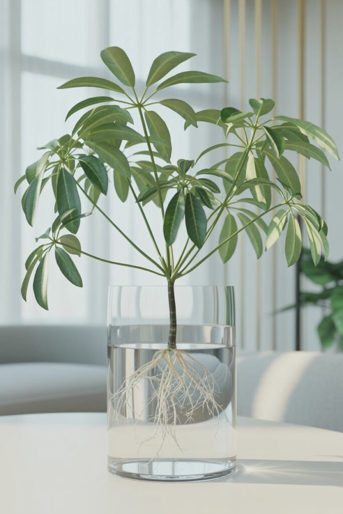 Schefflera stems stay stable in water and root quickly with consistent warmth. Their flexible growth habits make them easy to start from small cuttings.