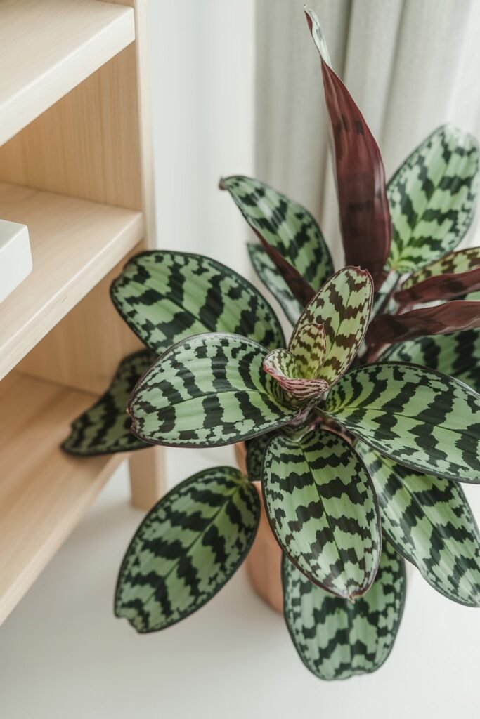 The Rattlesnake Plant is the showstopper of low-light gardening. Its long, wavy leaves are painted in rich green with deep purple undersides it’s pure art in plant form.