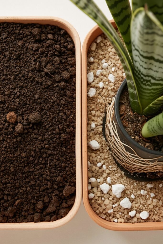 Dense soil restricts airflow and traps moisture around the roots. Snake plants need oxygen just as much as they need water.