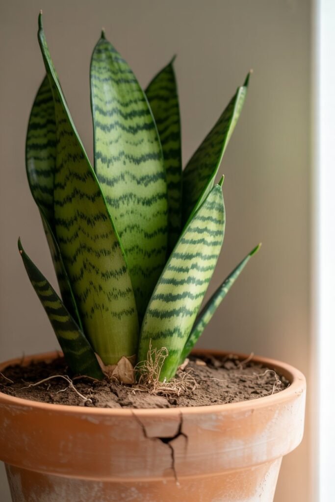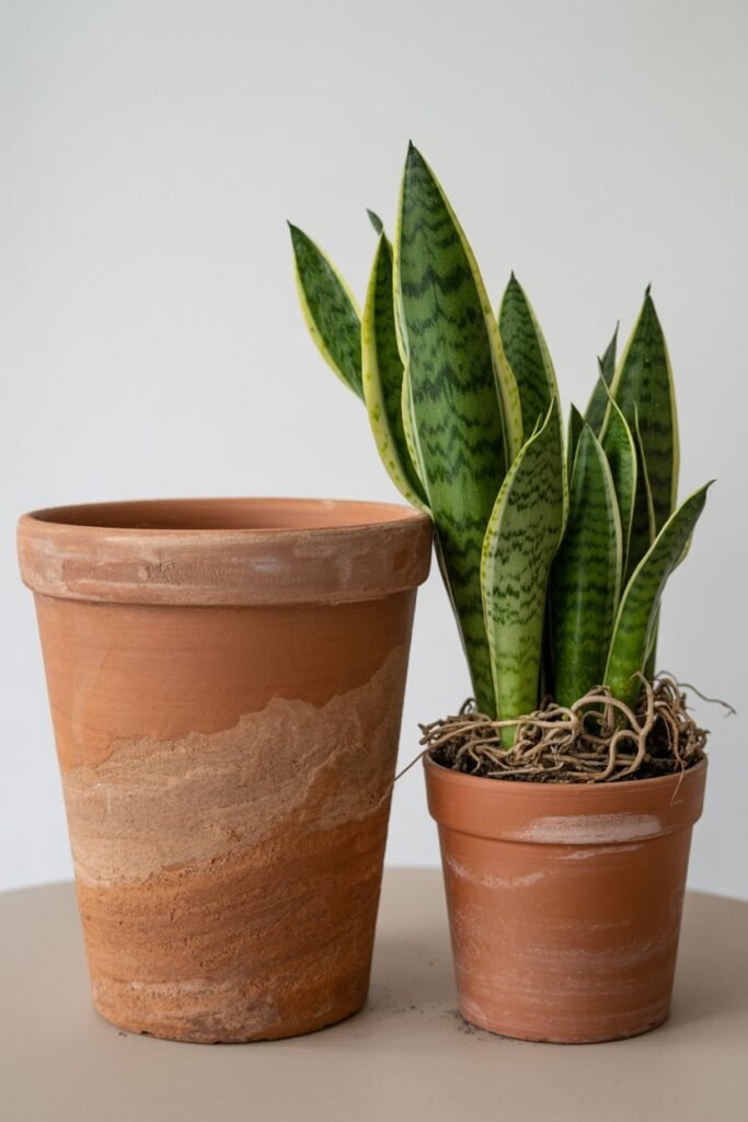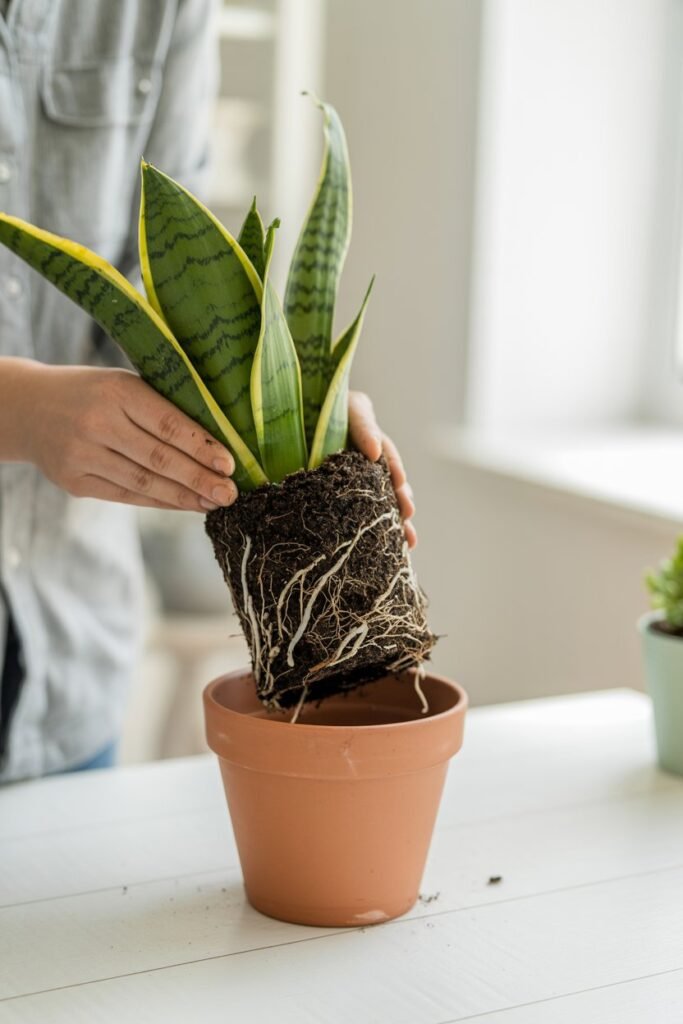 Snake plants prefer consistency. Most only need repotting every 2–5 years.