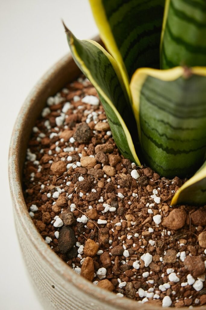 This blend prevents water from sitting around the roots and mimics the dry conditions snake plants love.