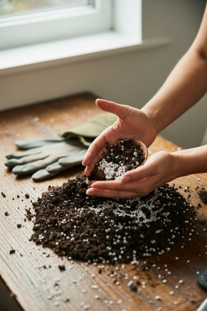 Before touching your plant, prepare your soil mix and workspace. Light, airy soil is the foundation of a successful repotting.